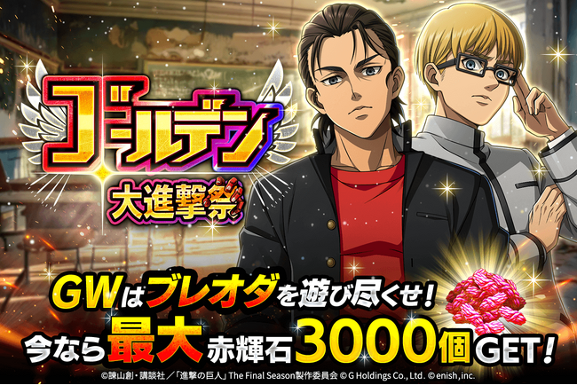 株式会社enish(本社:東京都港区、代表取締役社長:安徳 孝平、以下enish)は、アニメ『進撃の巨人』のスマートフォンゲーム最新作「進撃の巨人Brave Order」にて、2025年4月24日(木)より、ゴールデン大進撃祭を開催!今ならガチャなどに使用できる赤輝石が最大3,000個もらえちゃう!またゴールデン大進撃祭前半ミッションではライナーの特別な衣装、波乱の学び舎イベントでは育成素材の熟練技能書が最大300個がGET可能!その他、最新情報はゲーム公式サイト・ゲーム公式X(旧Twitter)アカウントにて随時公開して行きますので、ぜひご覧ください。