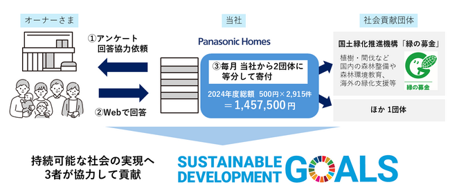 パナソニック ホームズ株式会社は、2024年度(2024年6月~2025年3月)に実施した、当社の戸建住宅のオーナーさまへの「お客さまアンケート」について、Webでの回答1件あたり500円、総額1,457,500円を、社会貢献活動に取り組む公益社団法人 国土緑化推進機構「緑の募金」と、ほか1団体、計2団体へ寄付しました。当社のオーナーさまと協力してSDGs領域で活動する団体を支援することで、持続可能な社会の実現への貢献を目指すものです。
