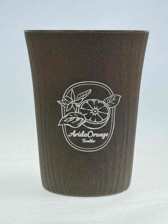 「果樹園のタンブラー 有田みかん」は、有田市内で栽培を営む農家のみかん剪定枝を51%使用しています。剪定枝とは果樹の育成や管理を目的に切りそろえられた枝の切りくずです。箕島高等学校がデザインしたタンブラーは、有田みかんの断面に花や葉を添えた様子を細やかに描きました。N高等学校・S高等学校がデザインしたタンブラーは、有田みかんが実った樹木をポップなテイストで描きました。