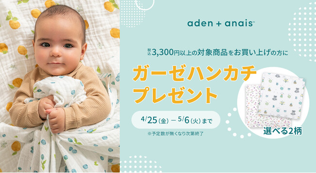 株式会社ダッドウェイ(本社:神奈川県横浜市、代表取締役社長:大野 浩人)は、「aden + anais(エイデンアンドアネイ)」のノベルティプレゼントキャンペーンを、DADWAY各店にて2025年4月25日から5月6日の期間限定で実施。エイデンアンドアネイの商品を税込3,300円以上ご購入で、ガーゼハンカチを1枚プレゼントいたします。