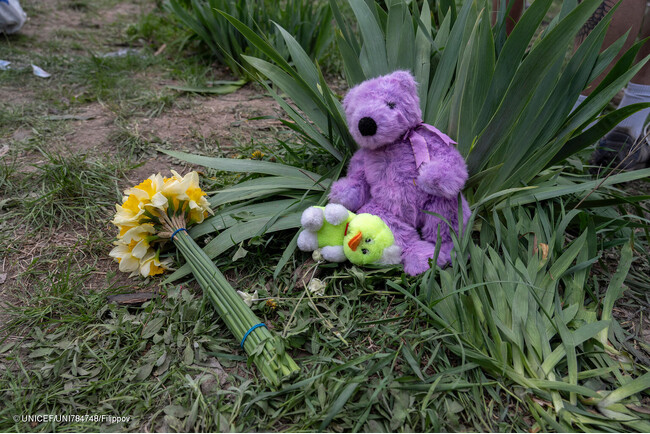 ミサイル攻撃の現場近くに供えられた花束とぬいぐるみ。早朝の住宅街への攻撃により、子ども3人を含む12人が死亡した(ウクライナ、2025年4月24日撮影) (C) UNICEF/UNI784748/Filippov