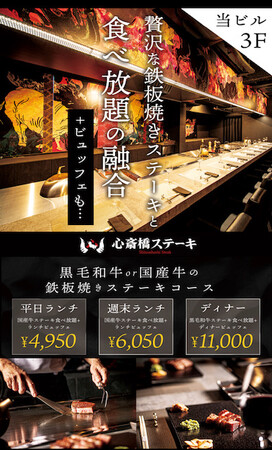 大阪・鉄板焼きステーキ専門店『Oh!マイステーキ』を運営する西京株式会社(本社:大阪市 代表取締役 吉田 智)は、『高級な鉄板焼ステーキを高級感そのままに、かつリーズナブルに楽しんで頂きたい』をコンセプトとし追求した店舗を運営中。その西京株式会社は、鉄板焼きステーキ店では希少な、ステーキ食べ放題とビュッフェ形式のお店を2024年4月1日同ビル3Fに『心斎橋ステーキ』として新規オープン。