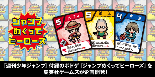 株式会社集英社ゲームズ(本社:東京都千代田区、以下 集英社ゲームズ)は、集英社が発行する少年漫画誌『週刊少年ジャンプ』の付録として、オリジナルボードゲーム『ジャンプめくってヒーローズ』を企画・開発したことを本日発表いたしました。『ジャンプめくってヒーローズ』は、全19枚のジャンプヒーローたちのカードから、お互いが交互に1枚ずつカードを取ってデッキをつくり、1対1の勝ち抜きバトルをするゲームです。それぞれのカードには、パワーと能力があり、カードのコンビネーションを駆使して相手のデッキを全て無くしたプレイヤーが勝利するボードゲームとなっています。