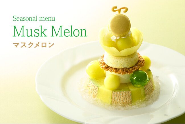 抹茶クランチチョコやメロンマスカルポーネ、フロランタン、メロンチーズスフレなどを重ね、トップにメロンをモチーフにしたマカロンを飾りました。フルーティーな香りの白ワインゼリーは、360°敷き詰めたマスクメロンの高貴な香りにペアリングしています。