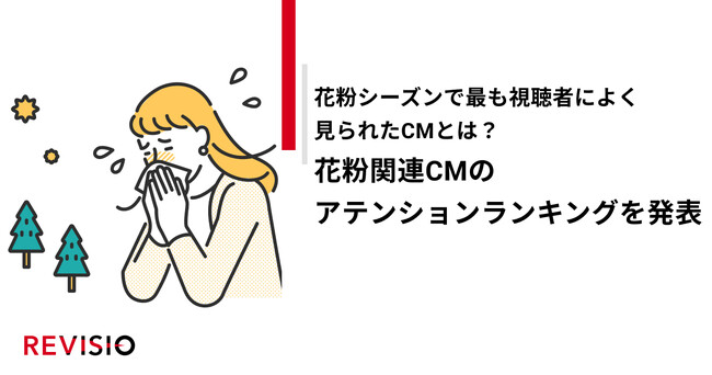 ご家庭に人体認識技術を搭載した機器を設置し、テレビスクリーンの「アテンション(注視)」を測るREVISIO株式会社(旧TVISION INSIGHTS株式会社、所在地 :東京都千代田区、代表取締役社長 郡谷 康士、以下REVISIO)は、「花粉」をキーワードにしたテレビCMについて、独自の「アテンション(注視)データ」で分析したランキングを公開しました。