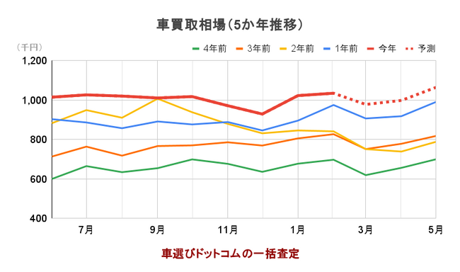 今年2月には、「車選びドットコム」の独自集計において、買取相場が過去最高値を記録しましたが、現在は一時的に落ち着いた状況です。しかし、夏に向けて再び上昇傾向にあります。