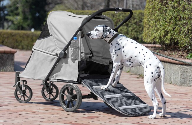 【タンスのゲン】抱っこ不要でシニア犬・大型犬もラクラク乗車の“スロープ付きペットカート”が新登場スロープを使って自分でカートに乗ることが可能な“快適散歩”、足腰の弱った老犬・大型犬の味方!