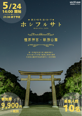 アストロツーリズムのイベント企画・運営を行っている合同会社ウンチク(本社:奈良県奈良市、代表社員:太田原 章巨)は、 橿原神宮と畝傍山を会場とした「ホシフルサト ー橿原神宮・畝傍山篇ー」を2025年5月5月24日(土)に開催いたします。