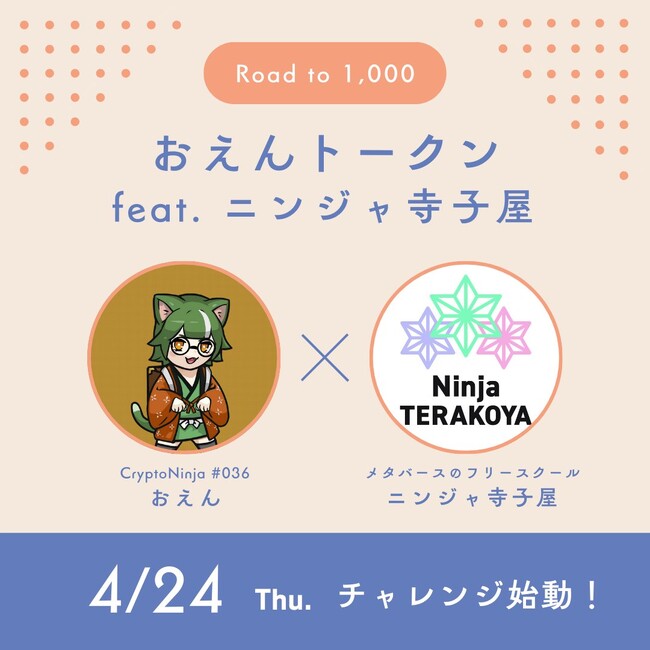 - 達成時の報酬目標を達成すると、ニンジャ寺子屋独自のコミュニティトークン「おえんトークン feat. ニンジャ寺子屋」の正式発行・販売が可能になります。