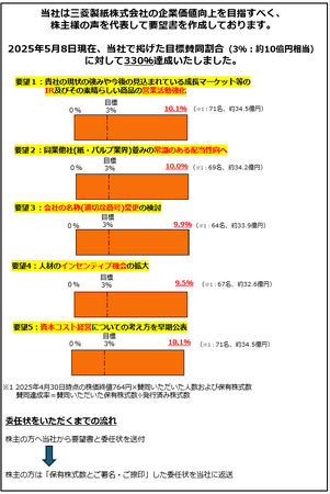 2025年5月8日、株式会社クラウドファンディング(東京都渋谷区、代表取締役:伊東修、以下「当社」)は、三菱製紙株式会社(東京都墨田区、代表取締役社長:木坂隆一、以下「同社」)に対し提出した企業価値向上を目的とする要望書に対して、同社の株主の皆様からいただいた賛同の委任状が、発行済株式数の約10%を超える結果となりました。これにより、当社が掲げた目標賛同割合3%に対して、約330%達成いたしました。