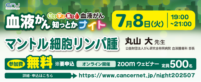 認定NPO法人キャンサーネットジャパン(東京都文京区 理事長 岩瀬 哲)は、血液がんに関するオンラインセミナー「血液がん知っとかナイト」を開催しており、第17回となる7月は「マントル細胞リンパ腫」をテーマに開催する運びとなりました。