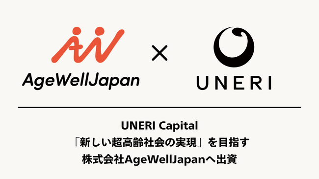 株式会社UNERI(本社:愛知県名古屋市、代表取締役:河合 将樹)は、運営するファンドUNERI Capitalを通じて、株式会社AgeWellJapan(本社:東京都渋谷区、代表取締役:赤木 円香、以下「AgeWellJapan」)への出資を実施したことをお知らせします。