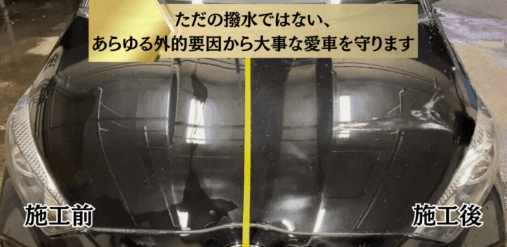 ボンネット右側が施工済み、コーティング施工済みの綺麗なお車でも更に美しく仕上げます。