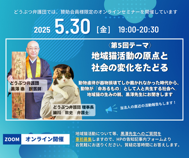 【どうぶつ弁護団】2025.5.30(金)地域猫活動の原点を学ぶ ゲスト:地域猫の生みの親 黒澤泰先生 /第5回賛助会員向けオンラインセミナーのご案内