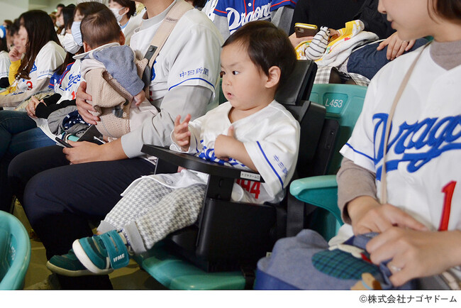 IKOUポータブルチェアは、スタジアム等の椅子にも設置可能。小さなお子様連れの家族も一緒にスポーツ観戦を楽しめます。※写真は、IKOUポータブルチェアをご導入・お客様へのレンタルサービスをされているバンテリンドームナゴヤ(株式会社ナゴヤドーム)様での様子。