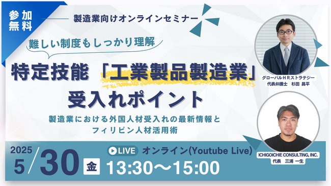 ICHIGOICHIE CONSULTING, INC.(本社:フィリピン、代表取締役:三浦一生)は、2025年5月30日(金)製造業企業の人事ご担当者様や、製造業の外国人材雇用に携わる方向けに、工業製品製造分野における特定技能制度に関するオンラインセミナーを開催いたします。