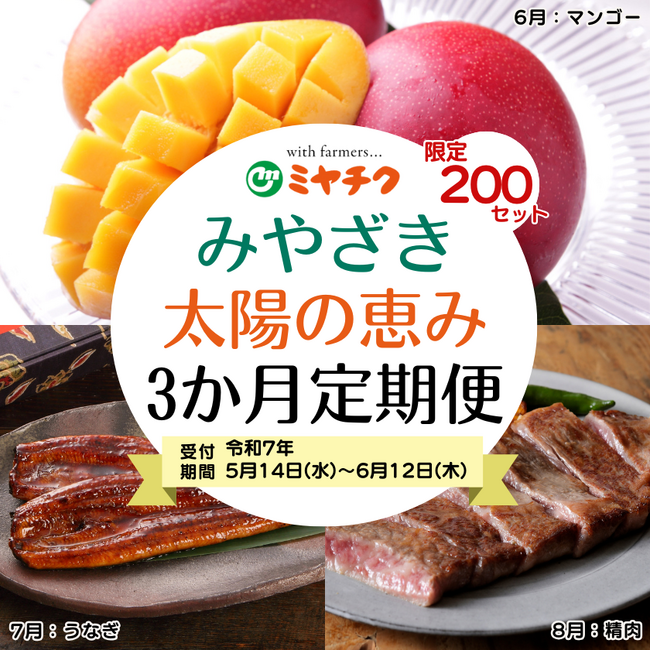 株式会社ミヤチク(本社:宮崎県都城市/代表取締役社長:船ヶ山 祐二)が運営する通販サイト「ミヤチクオンラインショップ」にて、5/14(水)から、6月~8月まで毎月商品をお届けする”みやざき太陽の恵み3ヶ月定期便”の受付を開始しました!