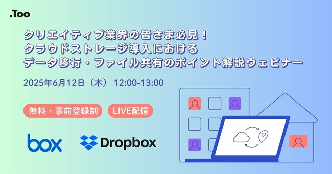 クリエイティブ市場の総合商社・株式会社Too(本社/東京都港区虎ノ門3-4-7、社長/石井剛太、以下Too)は、ウェビナー「クラウドストレージ導入におけるデータ移行・ファイル共有のポイント解説」を2025年6月12日(木)に開催します。
