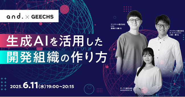 ギークス株式会社(本社:東京都渋谷区、代表取締役CEO:曽根原 稔人、以下ギークス)は、2025年6月11日(水)19:00~20:15にて、アンドドット株式会社(本社:東京都渋谷区、代表:茨木 雄太、以下アンドドット)と共催で、エンジニア・ンジニア採用担当者向けの無料セミナー「生成AIを活用した開発組織の作り方~今マネージャーが知るべき生成AIの最前線~」を開催します。