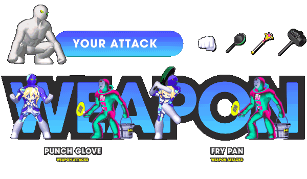 デートの道中、武器が落ちていたり?武器庫が無人販売していたりします。武器は見た目もレベルも威力も効果もそして音も様々。パンチやキック、100tハンマー??あなたの意志で武器を選び装備して、近接攻撃!