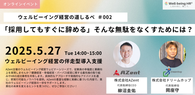 「従業員一人ひとりのはたらく幸せと業績向上の両立」を目指すHRサービス「Well-being HR」を提供し、ウェルビーイング経営の伴走型導入支援を行う株式会社AZent(本社:東京都港区、代表取締役CEO:柳沼圭佑、読み:アゼント、以下AZent)は、2025年5月27日(火) 14時より、株式会社ドリームホップ(本社:東京都千代田区、代表取締役:岡座守、以下ドリームホップ)と共同で「ウェルビーイング経営の道しるべ」第2回『「採用してもすぐに辞める」そんな無駄をなくすためには?』をオンライン開催することをお知らせいたします。