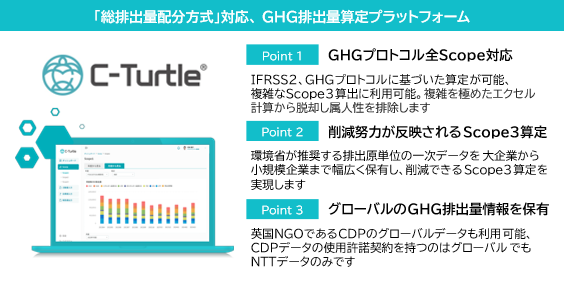 C-Turtleは、削減できるScope3(注5)算定を実現するNTTデータが開発したGHG排出量可視化プラットフォームです。一般的に、Scope3の算定は「活動量(企業の活動規模)」×「排出原単位(市場平均値)」で算定されることが多く、企業の削減努力を反映することが難しいという課題があります。C-Turtleは、Scope3の算定に、サプライヤーの排出量(一次データ)を活用し、サプライヤーの削減努力を自社排出量に取り込むことができる「総排出量配分方式」を採用しています。これにより投融資先の排出量削減努力との連携が可能になり、サプライチェーンを通じたGHG排出量の算定・削減の推進が可能となります。