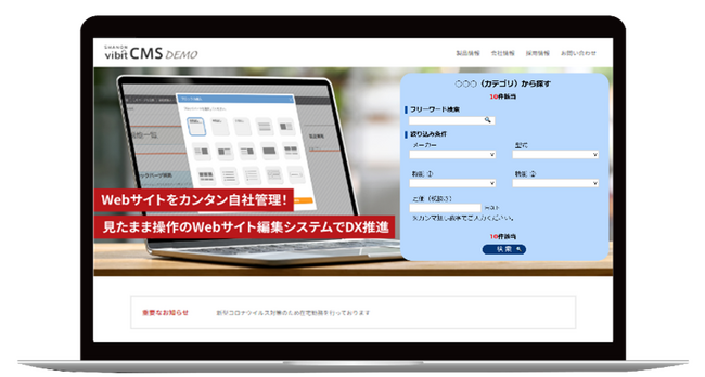 「じぶんでDX 製品情報検索システム オプションサービス」は、SHANON vibit CMS cloud(以下CMS)を活用し、専門知識不要で製品検索サイトを構築できるオプションサービスです。