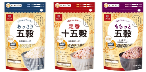 見た目や食感が白米に近く、どんなおかずとも合わせやすい「あっさり五穀」、雑穀らしい色付きやもちっと食感が楽しめる「もちっと五穀」、そしてバランスのとれた飽きない味わいの「定番十五穀」の3品展開です。