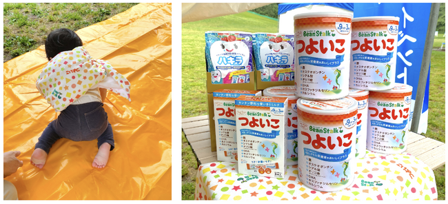 「つよいこ一升もち&栄養相談会」では、健やかな成長を祈る伝統行事“一升餅”をテーマにお餅をビーンスタークのフォローアップミルクつよいこに置き換えて、つよいこ(約1kg)を背負う体験を行いました。