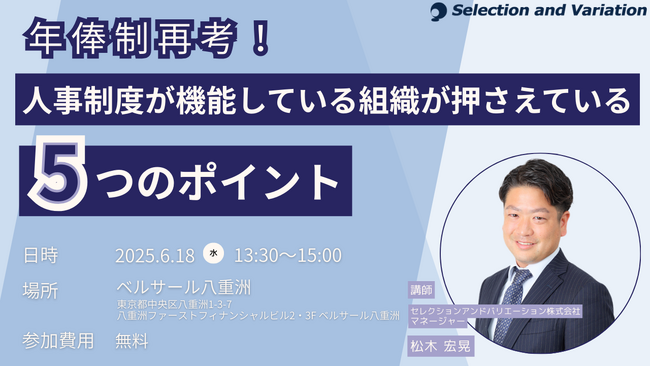 組織・人事コンサルティングファームであるセレクションアンドバリエーション株式会社(以下、当社、東京都千代田区丸の内、大阪市西区、名古屋市西区 / 代表取締役社長:平康慶浩/ URL: https://sele-vari.co.jp/ )は『【東京開催セミナー】年俸制再考!人事制度が機能している組織が押さえている5つのポイント』を2025年6月18日(水)13:30~15:00に開催することをお知らせいたします。