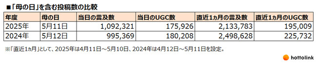 「母の日」を含む母の日当日の言及数は約109万件で、2024年よりも約9.8%増加しています。一方、当日のUGC数は約17.6万件で、2024年と比較して2.4%減少しました。また、直近1ヵ月の期間においても、言及数・UGC数ともに2024年よりも減少しました。
