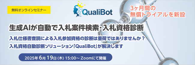 株式会社ニーズウェル(本社:東京都千代田区、代表取締役会長兼社長 船津浩三)は、2025年6月19日(木)15時より、無料オンラインセミナー「生成AIが自動で入札案件検索・入札資格診断 ~入札仕様書査読による入札参加資格の診断は重荷ではありませんか? 入札資格自動診断ソリューション「QualiBot」が解決します~」を開催します。
