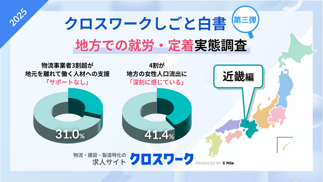 ノンデスク事業者向けの人材採用システム『クロスワーク』を提供するX Mile株式会社(読み:クロスマイル、本社:東京都新宿区、代表取締役:野呂 寛之、以下『当社』)は、物流業界の働き方に関する実態調査「クロスワークしごと白書2025」の第三弾として、『地方での就労・定着』に関する独自調査を実施しました。本調査の中から、近畿地方の物流業界の現状に着目したところ、地元から離れて働く人材や未経験者向けの支援の実態、さらに女性の地元離れへの課題意識の現状が浮き彫りになりました。