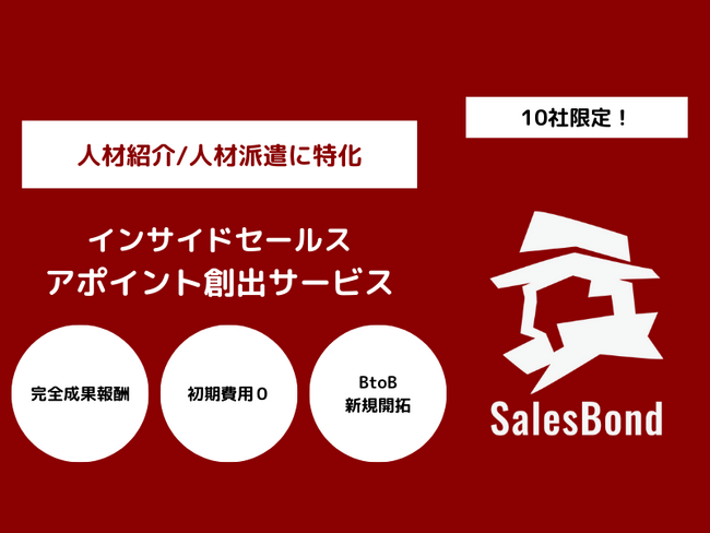 セールスボンド株式会社(本社:東京都新宿区、代表取締役:飯住孝裕)は、人材紹介サービスおよび人材派遣サービスに特化したアポイント獲得サービス「HUMANBOND」をリリースいたしました。