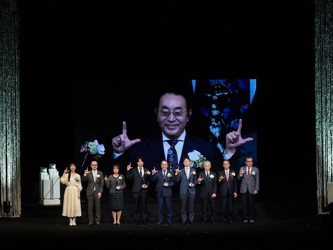 その後、華やかな音楽と演出の中、受賞者の4名が登場。大賞の菅氏は、光の道を通りながら、客席よりステージに登壇しました。山之内 すず氏がアンバサダーとして登壇し、昨年の大賞受賞者である浦野氏へトロフィーを手渡し、浦野氏から受賞者へ授与しました。理事長の矢冨と専務理事の家次からは、賞状と副賞が、受賞者4名へ手渡されました。トロフィーは、研究者の独創性を「暗闇の中の光」として捉え、それを体現するイメージでデザインされています。メッキ素材で仕上げた彫像の中に、点灯機能が組み込まれており、見た目の艶やかさだけではなく、実際に光を灯すユニークな設計です。