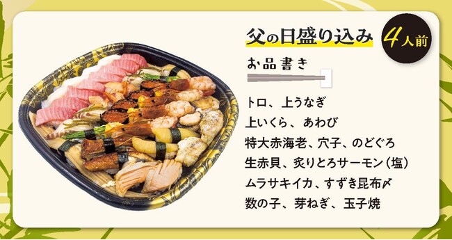 株式会社活美登利(本社:東京都品川区、代表取締役社長:土屋秀仁)が運営する「回し寿司活/寿司活」は、運営店舗全店で6月9日(月)~6月15日(日)の期間、父の日限定商品を販売いたします。