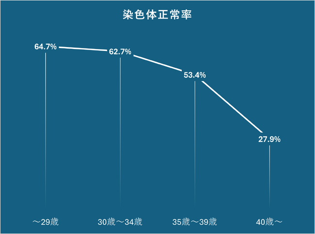 米国での研究論文の報告によると、20歳~34歳の年齢での染色体正常率は41%程度、35歳~39歳の年齢では37%程度、40代では26%程度という報告もあるため、B&Cの利用者の検査結果は非常に優良であることがわかりました。
