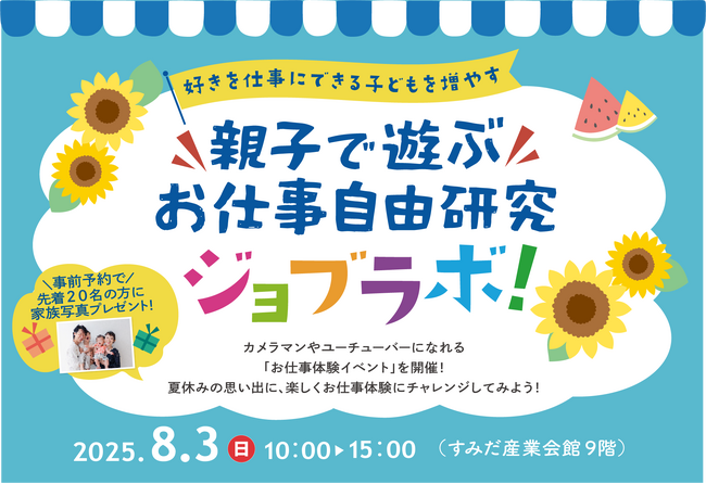 働き方が多様化するいま、子どもたちが「自分の好きなことを仕事にする力」を育むための体験型イベント【ジョブラボ!】を墨田区にて開催します。親子で参加できるワークショップやお仕事体験を通して、仕事=楽しい・選べるという前向きなキャリア観を育てることを目的としています。リアルな「働く」を自由研究のように学べる一日です。
