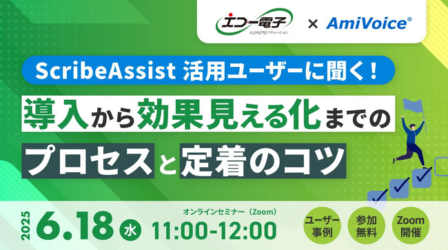 2025年6月18日(水)、株式会社アドバンスト・メディア(本社:東京都豊島区、代表取締役会長兼社長:鈴木清幸 以下、アドバンスト・メディア)は、オンラインセミナー「ScribeAssist活用ユーザーに聞く!導入から効果見える化までのプロセスと定着のコツ」を共催いたします。