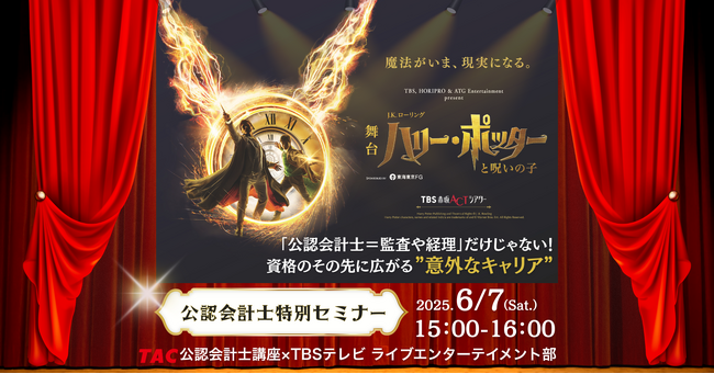 当社は、資格取得支援教育、人材育成、及び関連サービスの提供を通じて、社会に貢献することを目指しております。この度、株式会社TBSテレビ ライブエンタテインメント部様が手掛ける大ヒット舞台『ハリー・ポッターと呪いの子』のプロジェクトに関わる方々をゲストにお招きし、舞台のみどころや裏話、公演の成り立ちから現在に至るまでのお話、そしてその中で活躍する会計士の役割についてお話しいただく特別イベントを共催いたします。