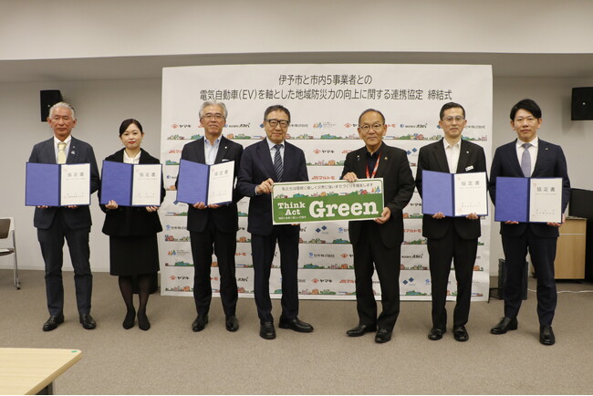 本協定は、電気自動車を増やし災害時の物資輸送や充電設備として活用しようと、伊予市が市内に事業所を置く企業5社と電気自動車の導入について取り決めたものです。伊予市は、災害時に電気自動車を軸とした市の持続可能性および地域防災力の向上を図る「EVが運ぶ地域の安全・安心プロジェクト」を推進してきました。本協定により、市だけでは台数が足りない電気自動車について、発災時に市からの要請があれば無償で貸与することになります。
