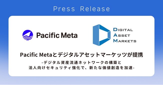 株式会社デジタルアセットマーケッツ(本社:東京都千代田区、代表取締役:西本 一也、以下「デジタルアセットマーケッツ」)は、Web3領域でアクセラレーター事業を展開する株式会社Pacific Meta(本社:東京都港区、代表取締役:岩崎翔太、以下「Pacific Meta」)と、このたび企業におけるデジタルアセットの活用支援を目的とした業務提携契約を締結しましたことをお知らせします。