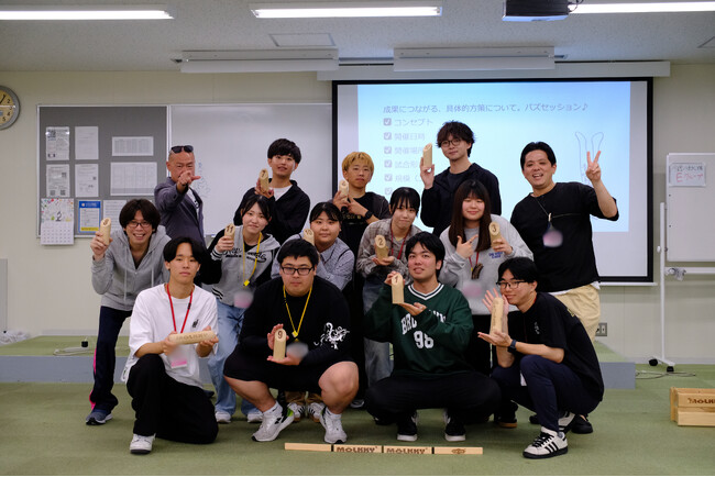 当日は、麻生医療福祉&保育専門学校(福岡市)にて、学生8名と教員2名、春一番のメンバー4名が参加。モルックの体験に加え、チーム対抗戦やルール説明などを通して、競技の楽しさを体感しました。