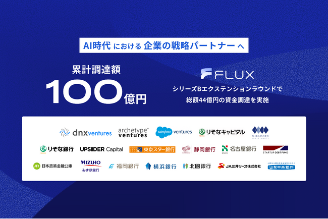 株式会社FLUX(読み:フラックス、本社:東京都渋谷区、代表取締役:永井元治、以下「FLUX」)はDNX Ventures、Archetype Ventures、Salesforce Ventures、りそなキャピタル、みらい創造インベストメンツらを引受先とする第三者割当増資および融資等を合わせて、総額44億円の資金調達をシリーズBエクステンションラウンドにて実施したことをお知らせいたします。今回の調達によりシリーズB全体の調達金額は88億円、累積資金調達額は100億円に到達します。
