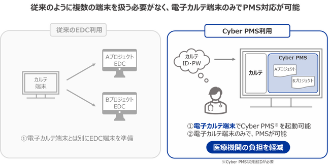 本サービスでは、PMSで求められるデータ収集をCyber PMSで実現します。Cyber PMSは、電子カルテ端末から起動するアプリケーションで、ER/ES指針で求められる監査証跡、電子署名、アカウント管理等の機能を有しています。本サービスをご利用いただくことで、従来のように、電子カルテとは別にEDC( Electronic Data Capture)等を準備し、重複してデータを入力する必要がなくなることから、医療機関のデータ入力・管理の負担を軽減できます。(図1参照)