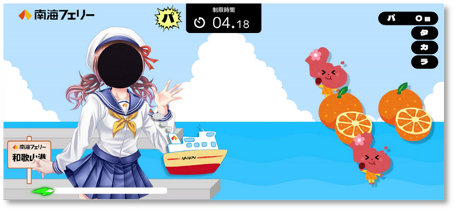 プレイヤーはスマホのインカメラを使用することで南海フェリーの公式萌えキャラの「阿波野まい」と「高野きらら」になりきり、「パ」「タ」「カ」「ラ」の連続発声で文字を飛ばしてアイテムを獲得!オリジナルキャラと自身のギャップも含めて楽しくくちトレしていただけます。