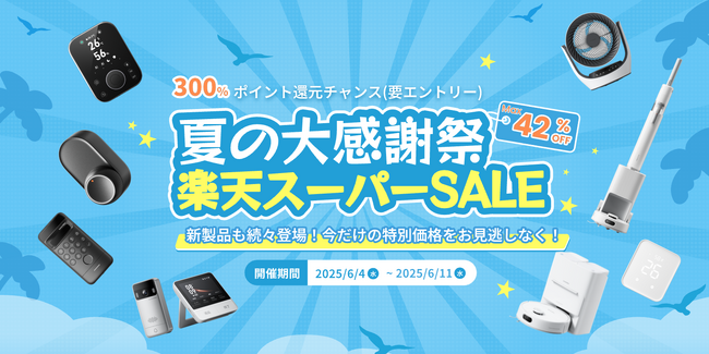 夏の電力ピーク対策として人気のスマートサーキュレーターやハブシリーズをはじめ、新発売のロックUltraやハブ3など、注目の王道製品も勢揃い。ほかにも、防犯対策に役立つセキュリティアイテムや、暮らしを自動化するスマート家電の数々もお値打ち価格に。また、期間中エントリーでお買い上げ額の300%ポイント還元のチャンスも!詳細は本文をご覧ください。