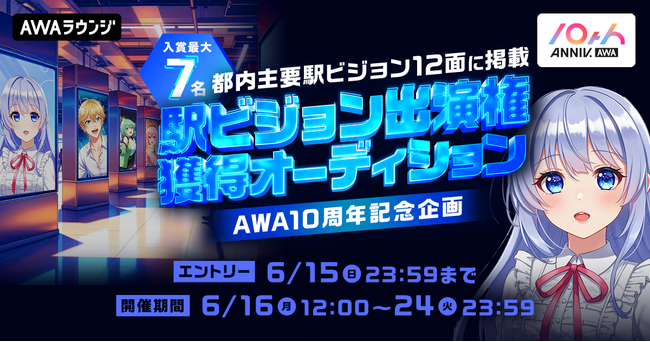 AWA株式会社(本社:東京都港区、代表取締役CEO:冨樫晃己)が運営する、サブスクリプション型(定額制)音楽ストリーミングサービス「AWA(アワ)」は、AWA10周年記念企画として、都内主要駅ビジョン12面に同時掲載されるチャンスを掴めるオーディションを開催いたします。