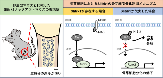Slitrk1が欠失したマウス(Slitrk1ノックアウトマウス)では皮質骨の厚みが減少しました。また、Slitrk1は骨芽細胞に存在し、骨芽細胞の分化・成熟とともにその量が増加すること、Slitrk1が存在しない骨芽細胞では、骨芽細胞の分化・成熟の能力が低下することが明らかになりました。Slitrk1が骨芽細胞の分化に関わるメカニズムとしてTazというタンパクと14-3-3タンパクに着目しました。Tazは骨芽細胞分化のマスターレギュレーターであるRunx2の転写共役因子で、骨芽細胞分化を促進することが知られています。Slitrk1ノックアウトマウスの骨芽細胞ではTAZのタンパク量が低下していることを確認しました。また、Slitrk1と14-3-3タンパクの結合ができなくなると、Tazのタンパクが分解され、減少することを明らかにしました。