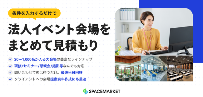 あらゆるスペースを貸し借りできるマーケットプレイス「スペースマーケット」を運営する株式会社スペースマーケット(本社:東京都渋谷区、代表取締役社長:重松大輔、以下、スペースマーケット)は、法人イベントに対応した会場の一括見積もりが簡単にできるサービスを開始いたしました。社内研修や、全社総会、懇親会など、イベント企画を担う人事・総務・広報担当者の「探す・選ぶ・比べる」負担を軽減するため、希望条件を入力するだけで、全国2,600件超の会場から最適な提案が届きます。